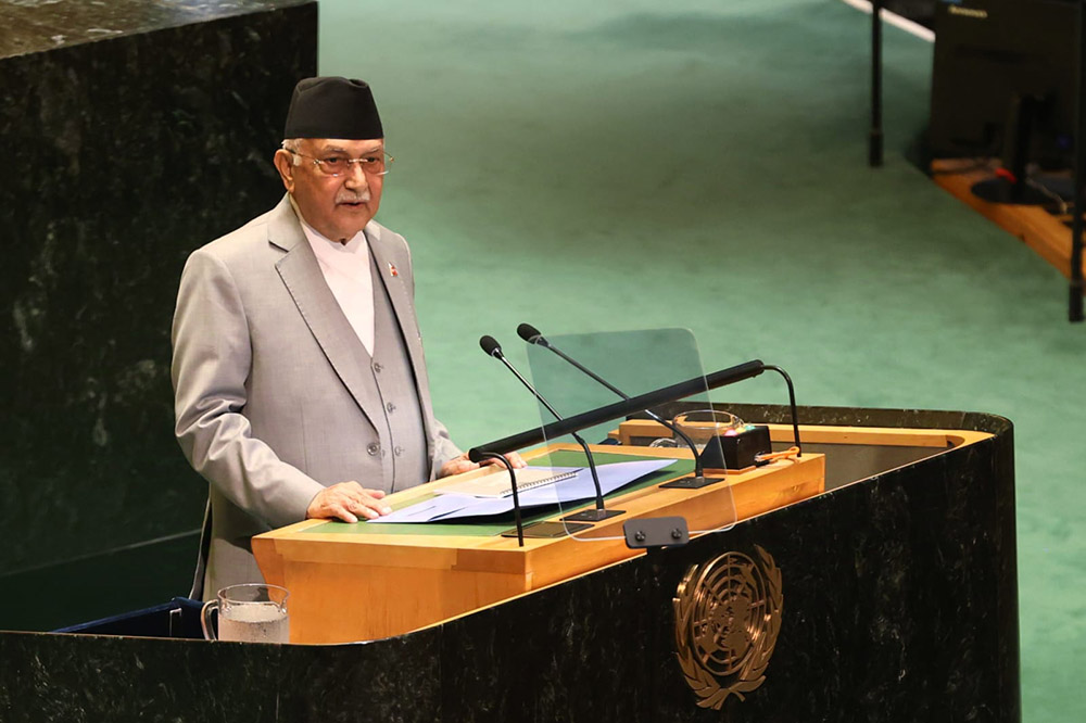 काठमाडौँ – प्रधानमन्त्री केपी शर्मा ओलीले संयुक्त राष्ट्रसंघको ७९औँ महासभालाई सम्बोधन गर्दै राष्ट्रसंघीय शान्ति अभियानमा सेना र प्रहरीको सबैभन्दा ठूलो योगदानकर्ताका रूपमा नेपाल विश्व शान्ति र सुरक्षामा आफ्नो योगदानलाई थप वृद्धि गर्न तयार रहेको बताएका छन् ।
