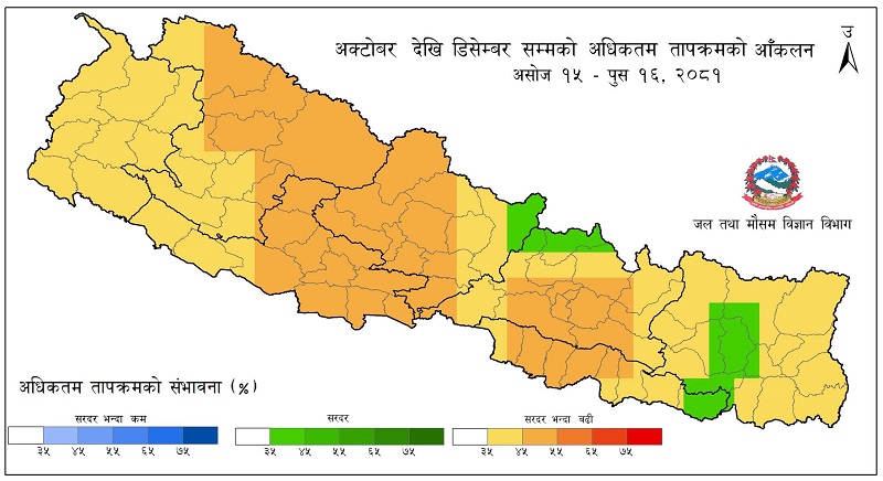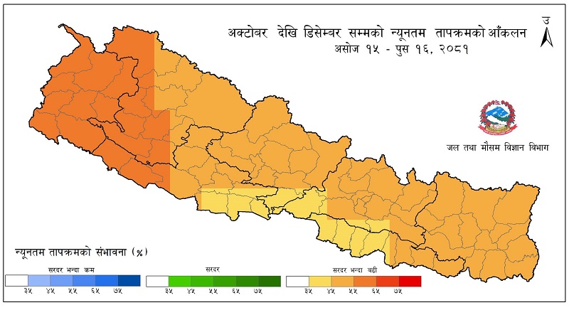 काठमाडौँ – यस वर्षको असोज १५ गतेदेखि पुस १६ गते अर्थात् (अक्टोबरदेखि डिसेम्बर) सम्मको तीन महिनामा पाँच वटा प्रदेशमा सरदरभन्दा बढी पानी पर्ने सम्भावना रहेकाे छ ।