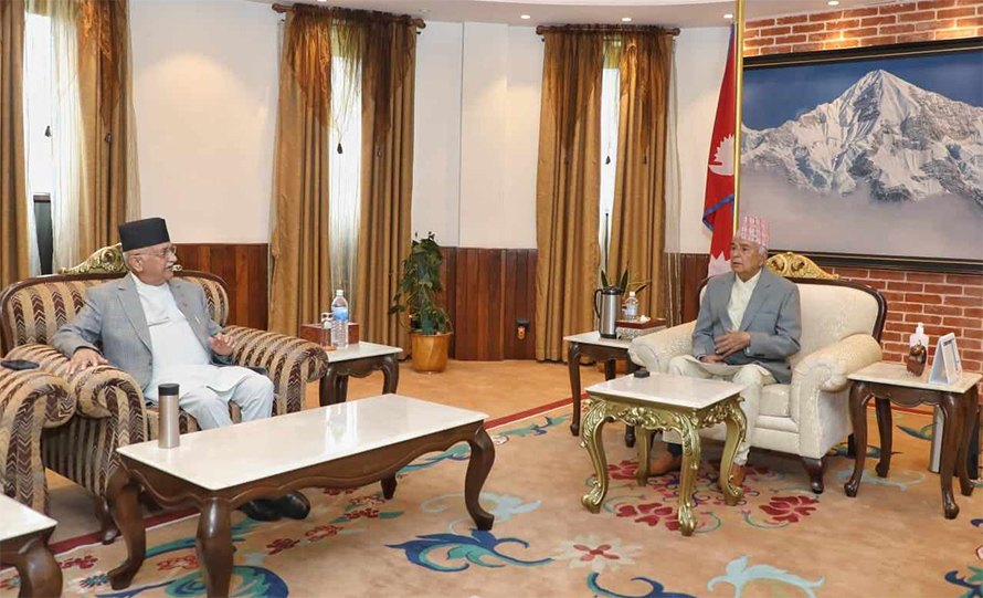 काठमाडौँ – राष्ट्रपति रामचन्द्र पौडेल र प्रधानमन्त्री केपी शर्मा ओलीबीच भेटवार्ता भएको छ। सोमबार राष्ट्रपति भवन, शीतल निवासमा भएको भेटवार्तामाहालै संयुक्त राज्य अमेरिकाको न्युुयोर्कमा सम्पन्न संयुुक्त राष्ट्रसङ्घको ७९ औँ महासभामा नेपाली प्रतिनिधिमण्डलको नेतृत्व गर्दै प्रधानमन्त्री ओलीको सहभागिताबारे रिपोर्टिङ गरेको उनको सचिवालयले जनाएको छ।