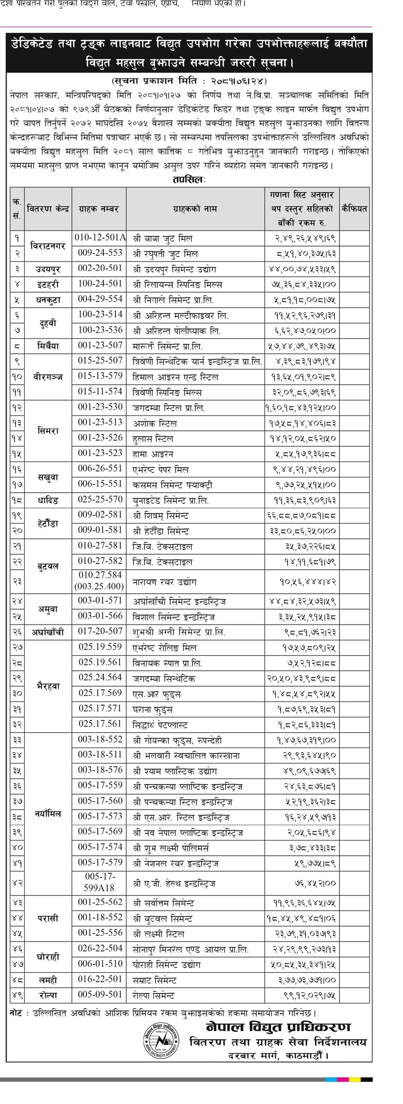 काठमाडौँ – विद्युत प्राधिकरणले ४९ उद्योगलाई कात्तिक ८ गतेभित्र डेडिकेटेड तथा ट्रंक लाइनको बक्यौता बुझाउन सार्वजनिक सूचना निकालेको छ। प्राधिकरणले बिहीबार सूचना निकाल्दै ती उद्योगहरूलाई गणना सिटअनुसार थप दस्तुरसहितको बक्यौता बुझाउन पुनः ताकेता गरेको छ।