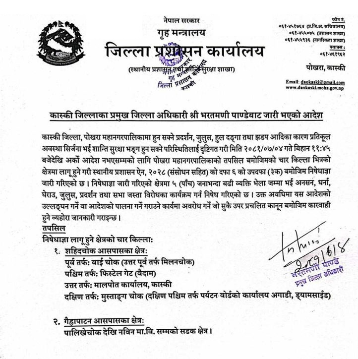 निषेधाज्ञा आजदेखि अर्को सूचना जारी नभएसम्म लागू हुने जिल्ला प्रशासन कार्यालय कास्कीले जनाएको छ । जिल्ला प्रहरी कार्यालय कास्कीले एक सूचना जारी गर्दै प्रदर्शन, जुलुस, हुलदंगा, झडप आदिका कारण प्रतिकूल अवस्था सिर्जना हुनसक्ने भएकाले निषेधाज्ञा जारी गरिएको जनाएको छ ।