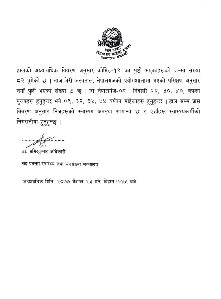 योसँगै नेपालमा कोरोनाभाइरस संक्रमितको संख्या ८२ जना पुगेको छ ।