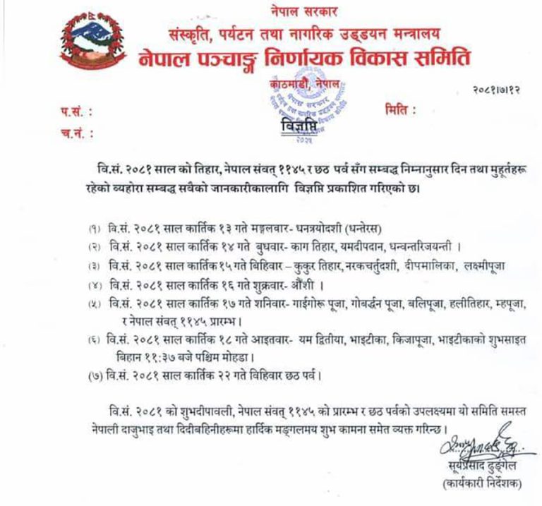 १४ गते काग तिहार, १५ गते कुकर तिहार परेको छ । त्यही दिन साँझ लक्ष्मीपूजा हुनेछ । १६ गते औंशी छ भने १७ गते शनिबार गाई गोरु तिहार परेको पाञ्चाङ्ग निर्णायक समितिले बताएको छ ।